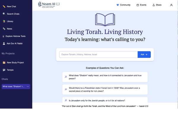The Bible tells us that in the last days, “Many peoples will come and say, ‘Come, let us go up to the mountain of the Lord… For out of Zion shall go forth the Torah, and the Word of the Lord from Jerusalem.’” (Isaiah 2:3) Noam AI is bringing this prophecy to life — creating the first global Torah learning movement, uniting Jews and Christians in the study of God’s eternal Word. When you give, you’re not just funding a project — you’re stepping into prophecy. Together, we’ll lay a cornerstone for a movement that will reach every nation, every language, and every believer hungry for truth. WATCH DEMO